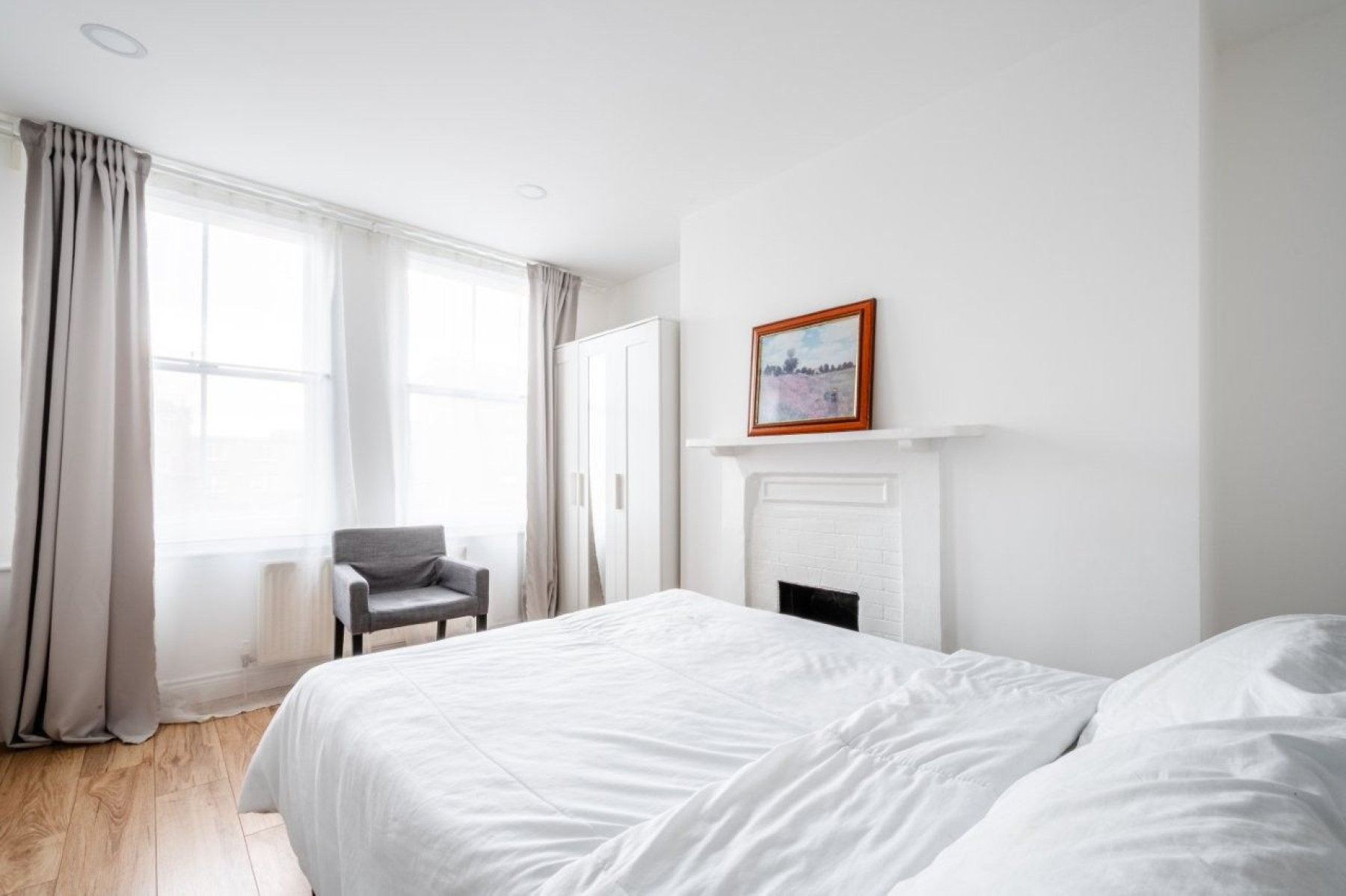 The bedroom is a well-proportioned double, offering a peaceful retreat from the bustle of the city with a freestanding wardrobe Serving the apartment is a neutral-toned bathroom suite with chrome fixtures.
