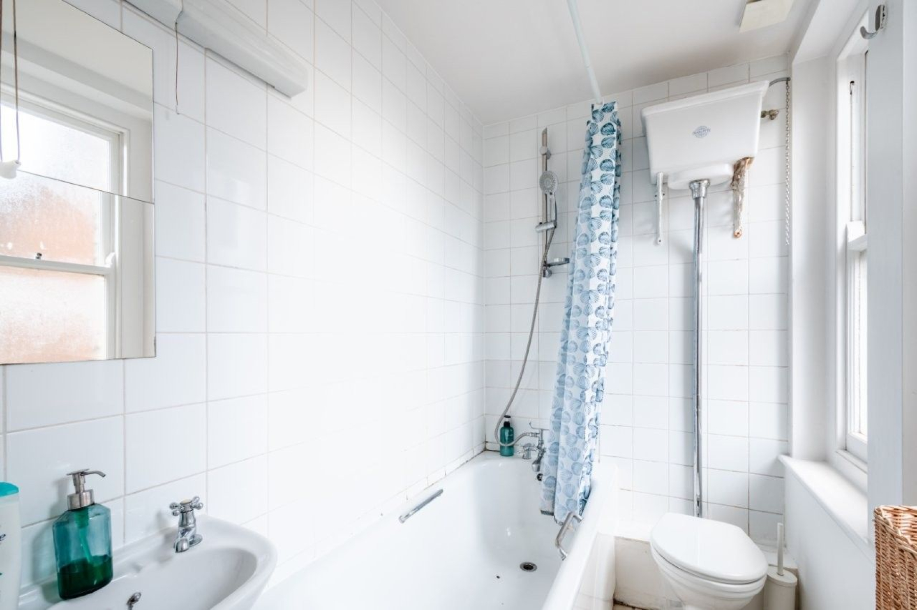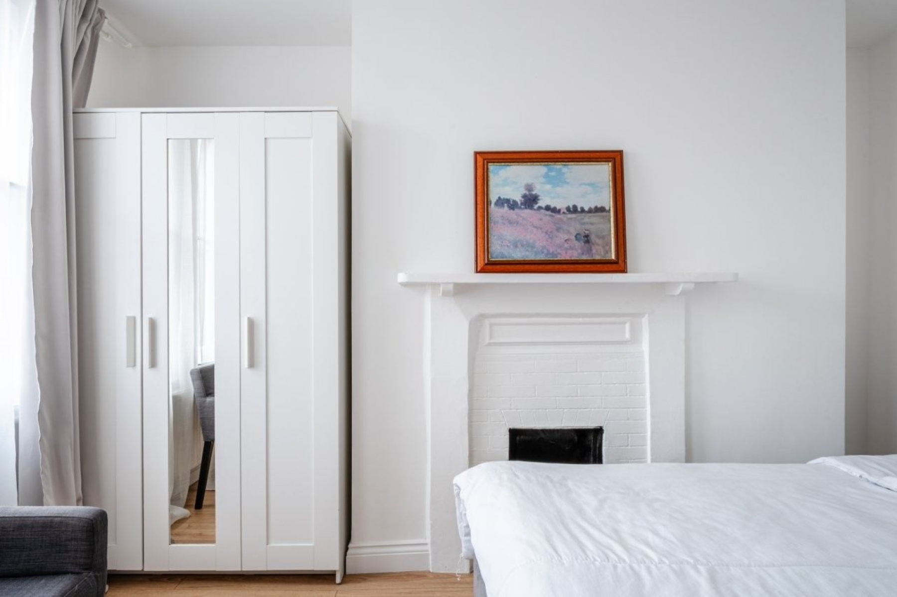 The bedroom is a well-proportioned double, offering a peaceful retreat from the bustle of the city with a freestanding wardrobe Serving the apartment is a neutral-toned bathroom suite with chrome fixtures.