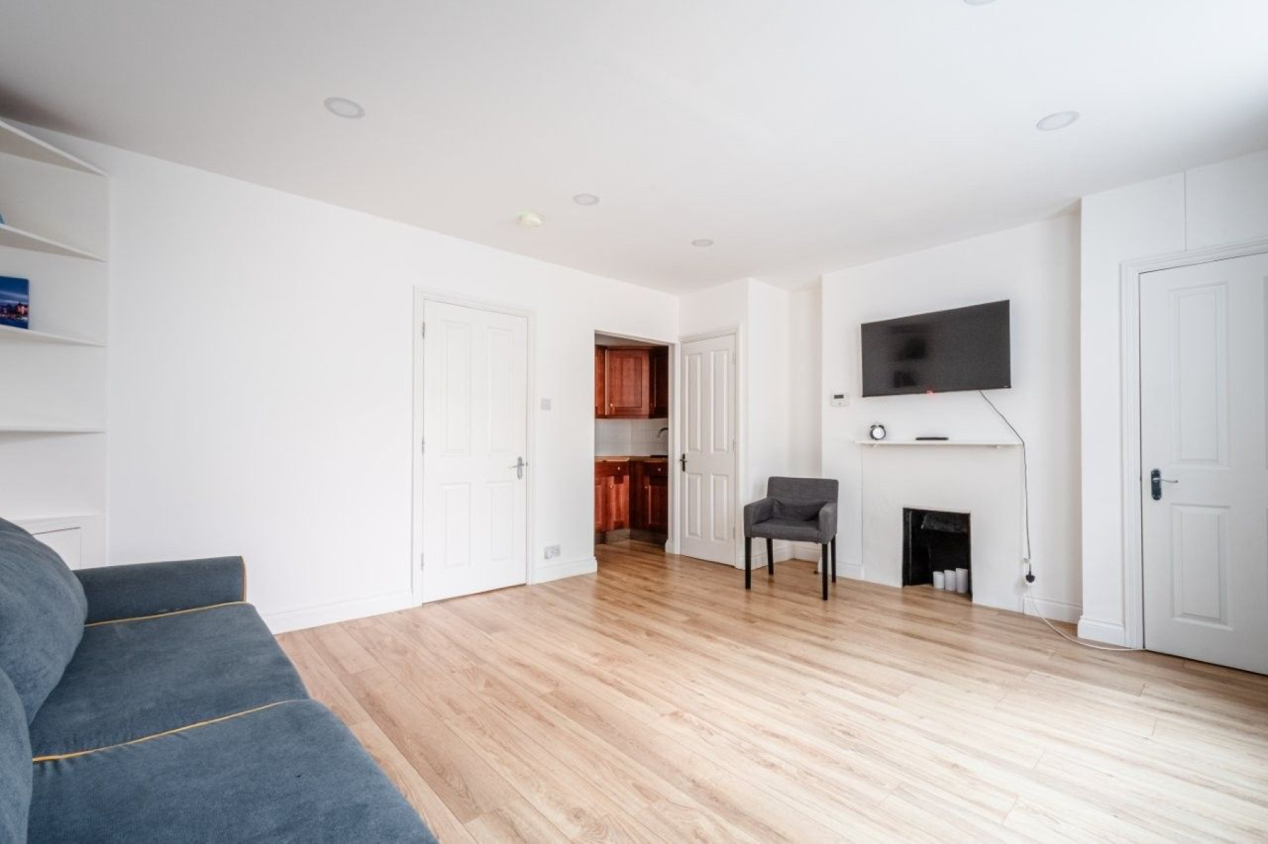 The heart of the home is a generous open-plan reception room that immediately impresses with its scale and natural light, courtesy of large windows overlooking the iconic street below. The space is thoughtfully laid out to accommodate a large lounge area and a separate dining zone, flowing seamlessly into a contemporary kitchen .